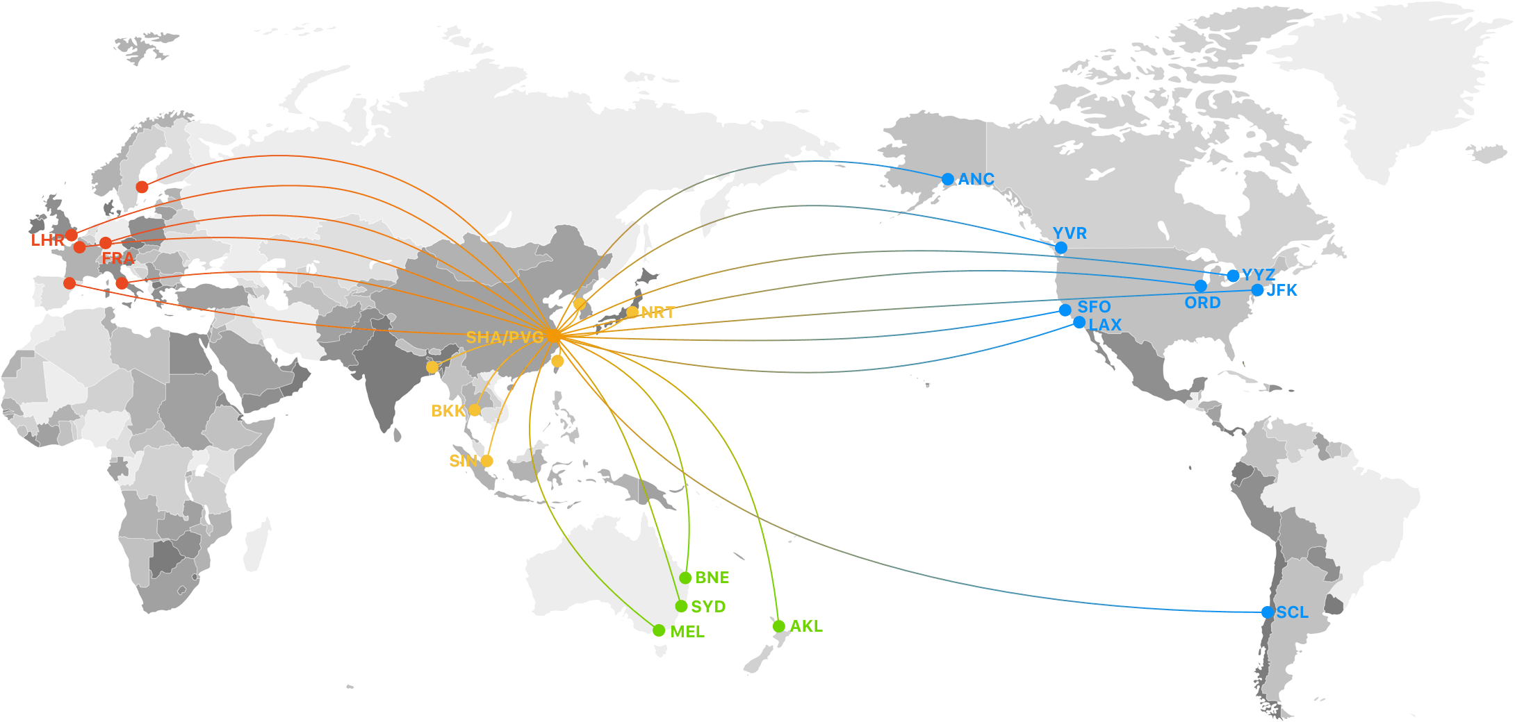 十余架全貨機(jī)和700多架客機(jī)腹艙資源,依托天合聯(lián)盟、代碼共享與SPA協(xié)議,航線(xiàn)網(wǎng)絡(luò)通達(dá)全球170個(gè)國(guó)家和地區(qū)的1036個(gè)目的地。